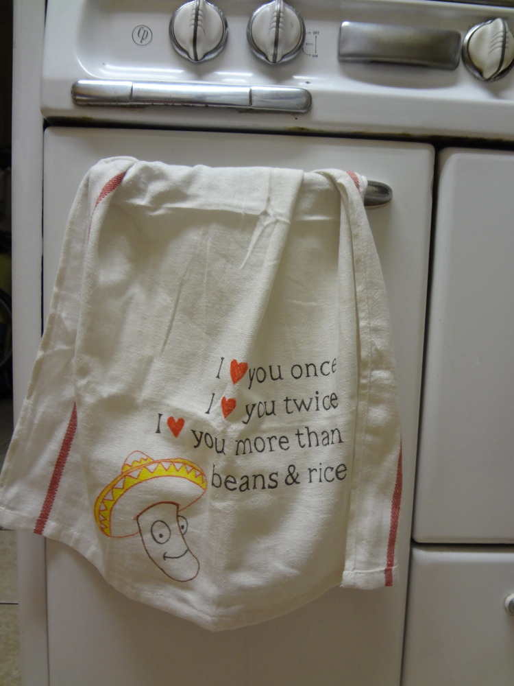 I felt compelled to buy this dish towel as a gift that so appropriately expresses my love