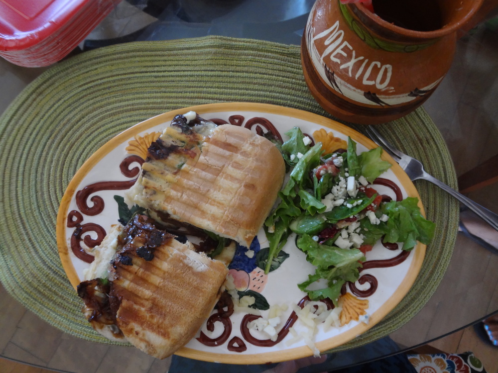 I am learning new recipes..veggie burger with arugula, blue & Gruyere cheese, topped with carmelized onions. Yum!