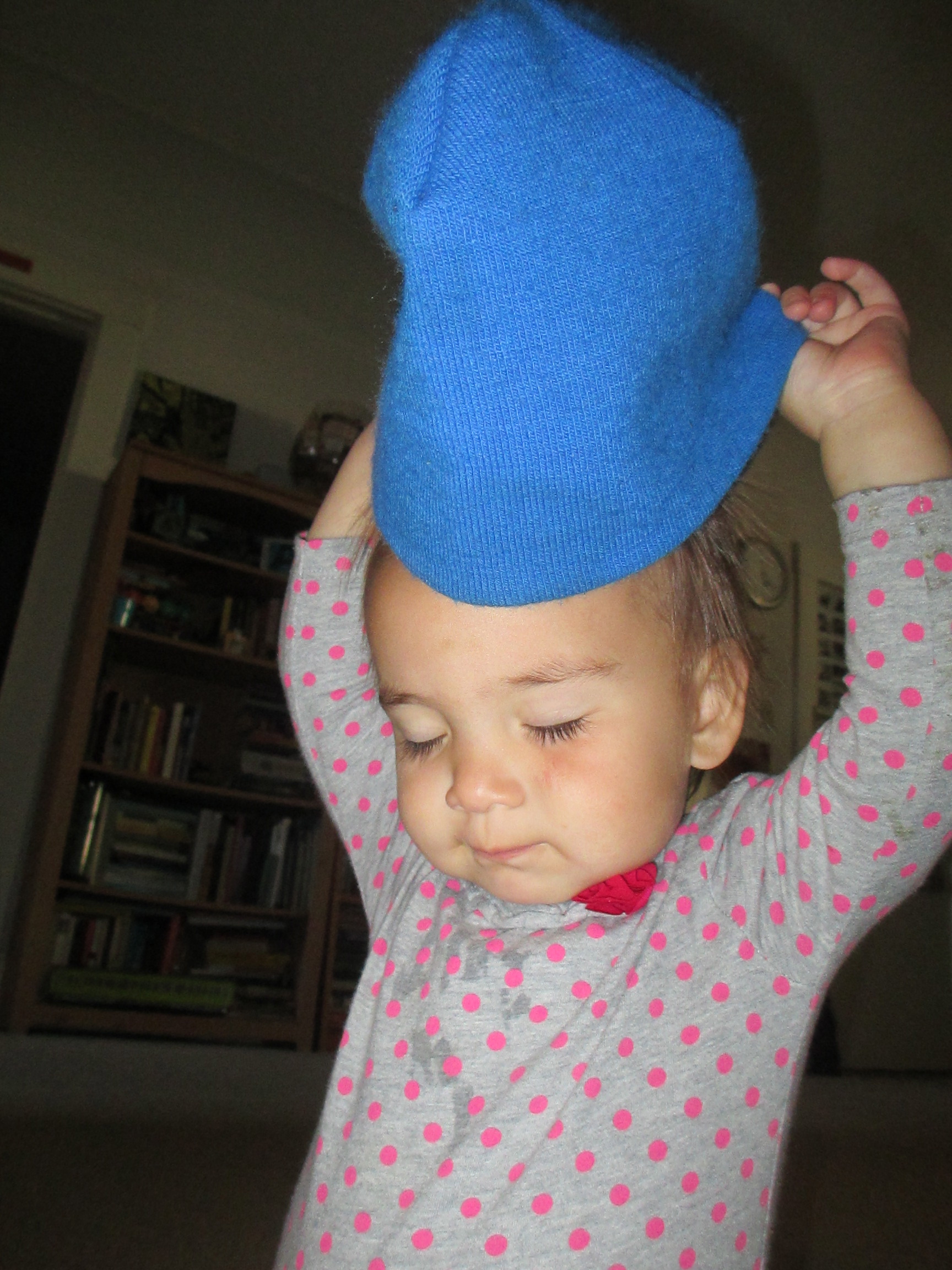 As I called little ones to the kitchen for dinner the boys came charging, but I had to go searching for Miss Olivine. When I found her she was giggling at herself and her newest trick with Paul’s hat.