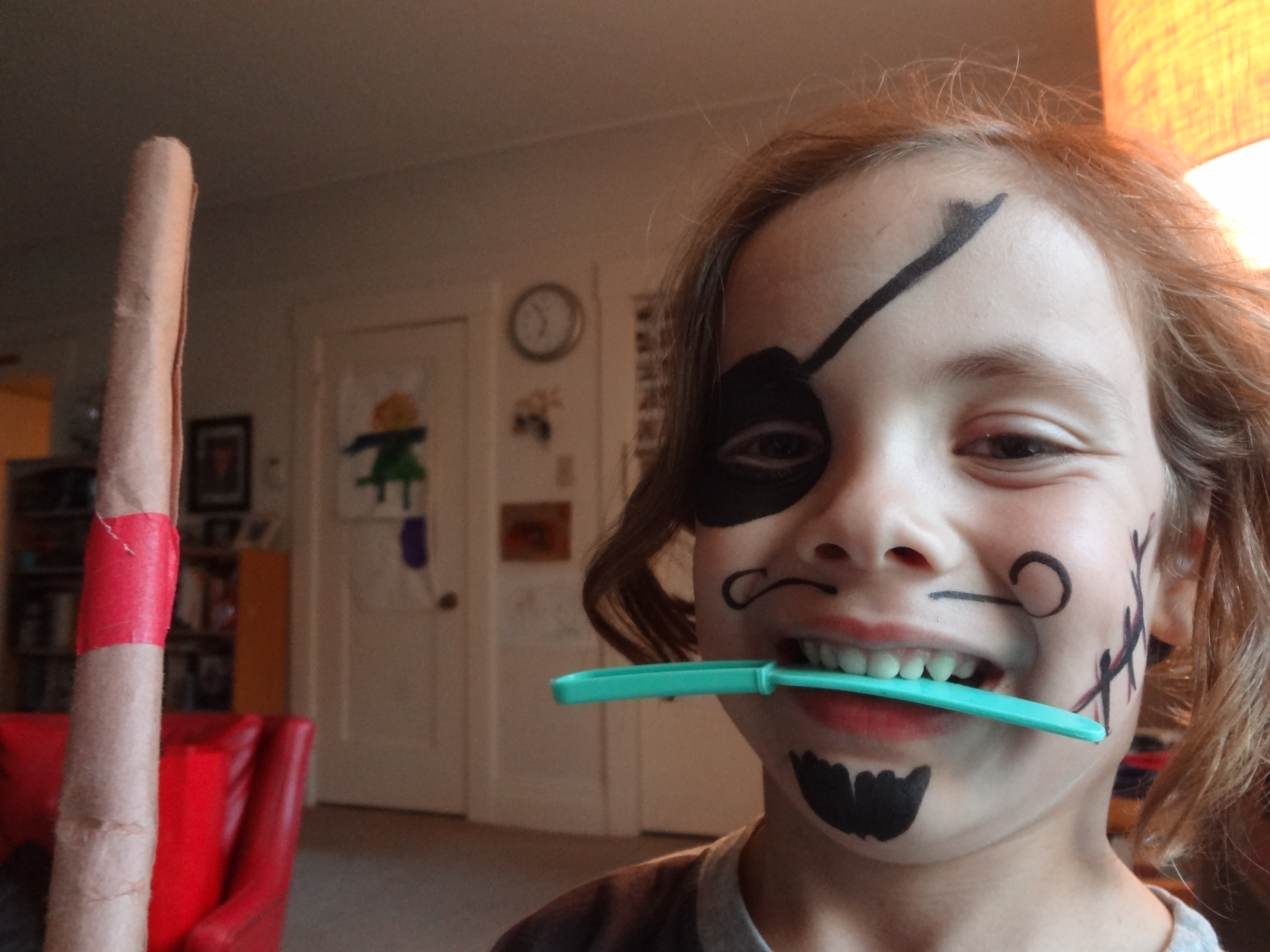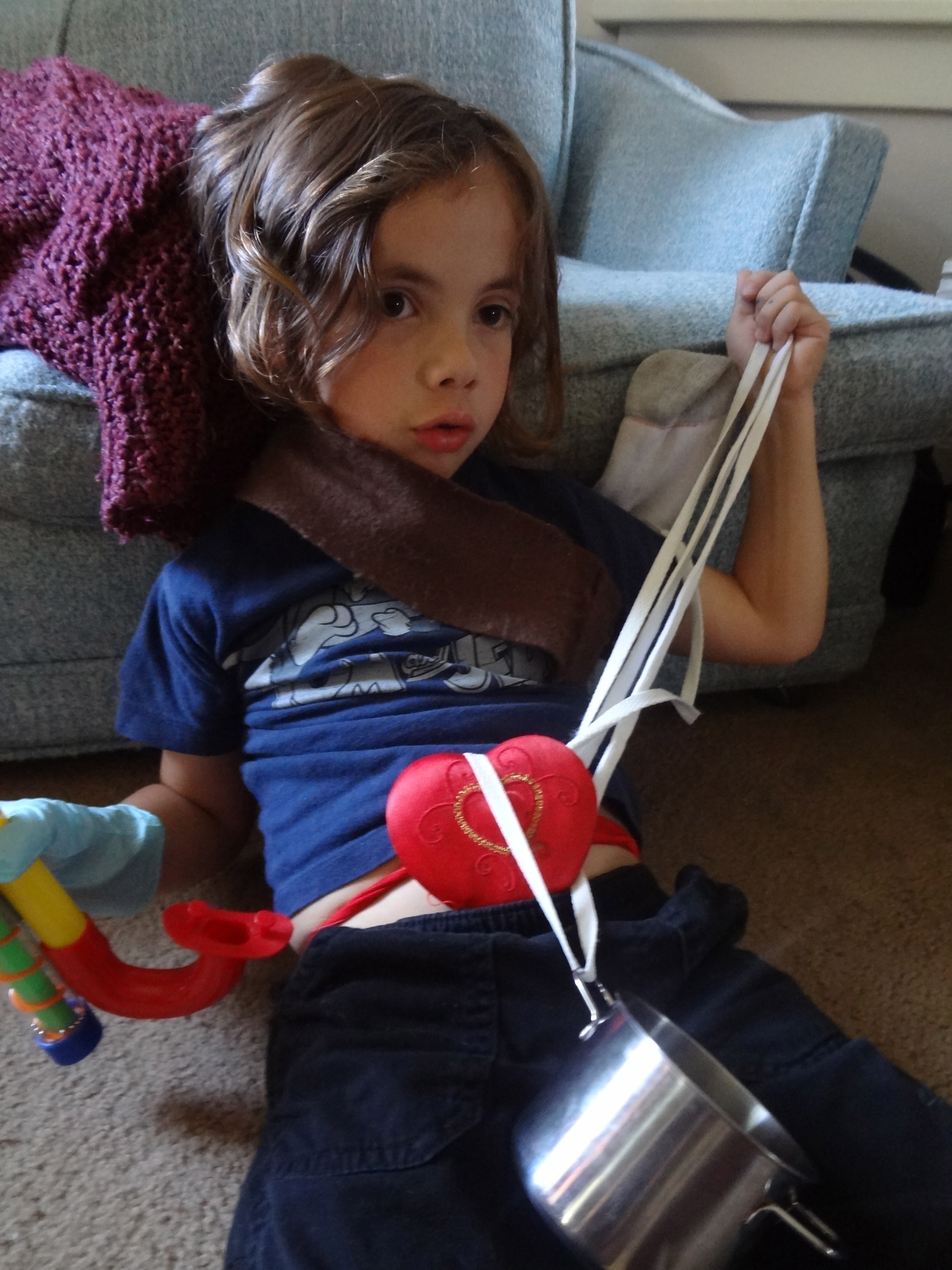We give lots of warnings so that little ones don’t feel like play is being interrupted. Tonight it was a fantastical game of climbing with a harness made from shoelaces while wearing a glove, belt, and various other climbing tools.