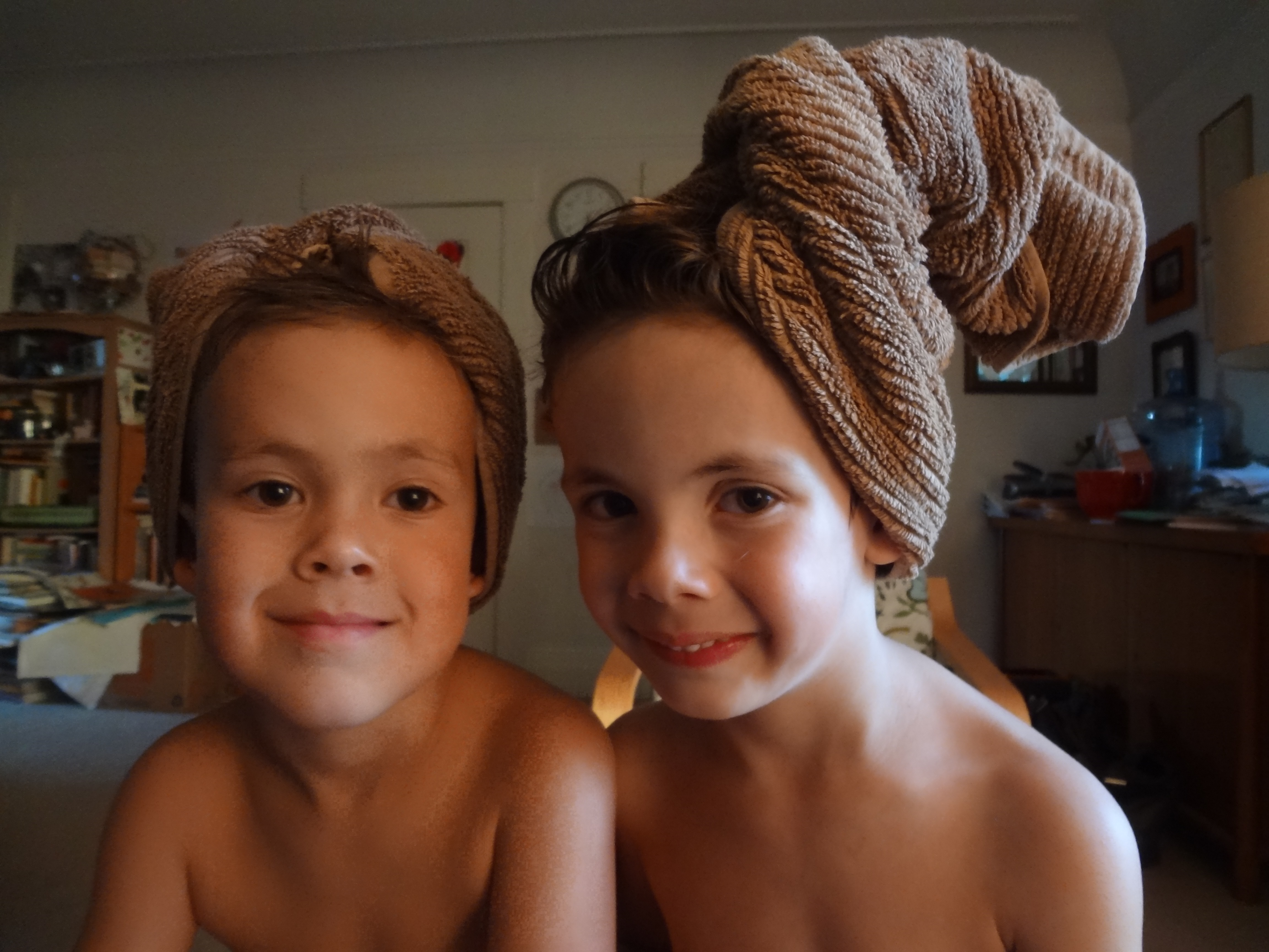 Last on my list is these two. After taking a shower they use our mini hand towels. They go between insisting I tie them around their waste so they can look like papa, to wanting the towels twisted and wrapped like they see their momma do with her hair.