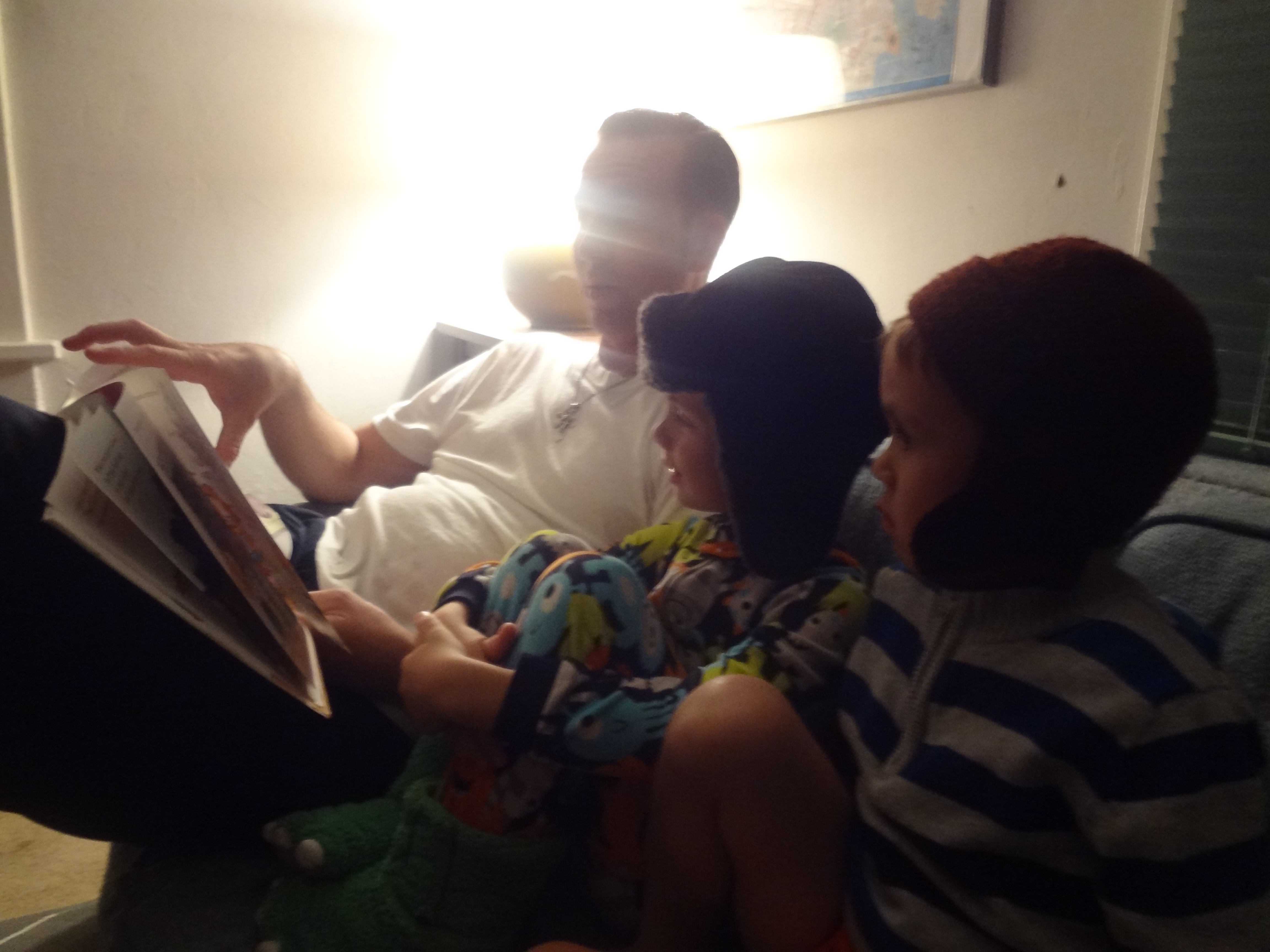 This photo was taken Saturday when our lovely friends babysat for us while I worked for four hours and then went to a four hour staff meeting, making it just a little longer than Papa who had an eight hour class. His bike almost always beats my car.