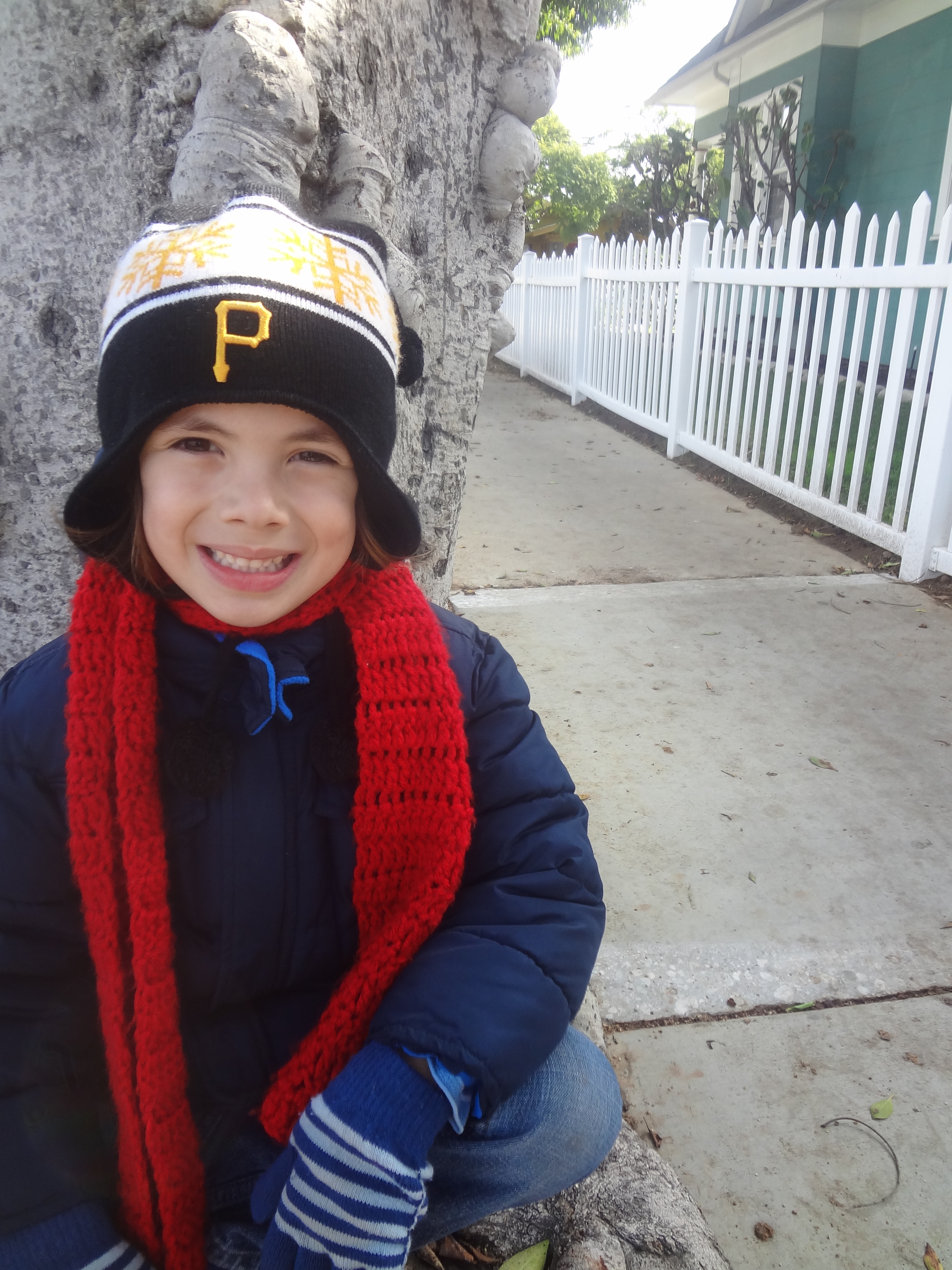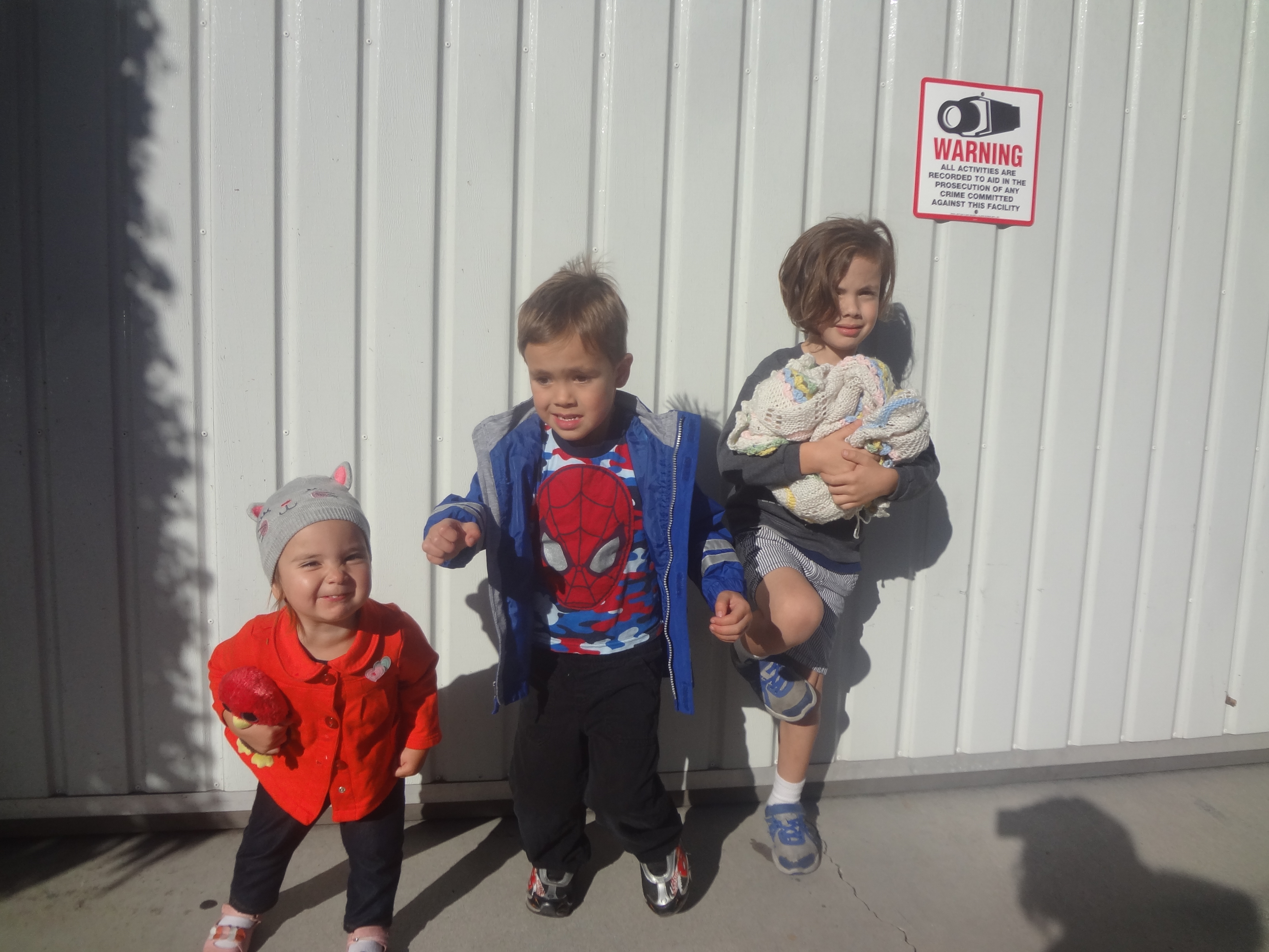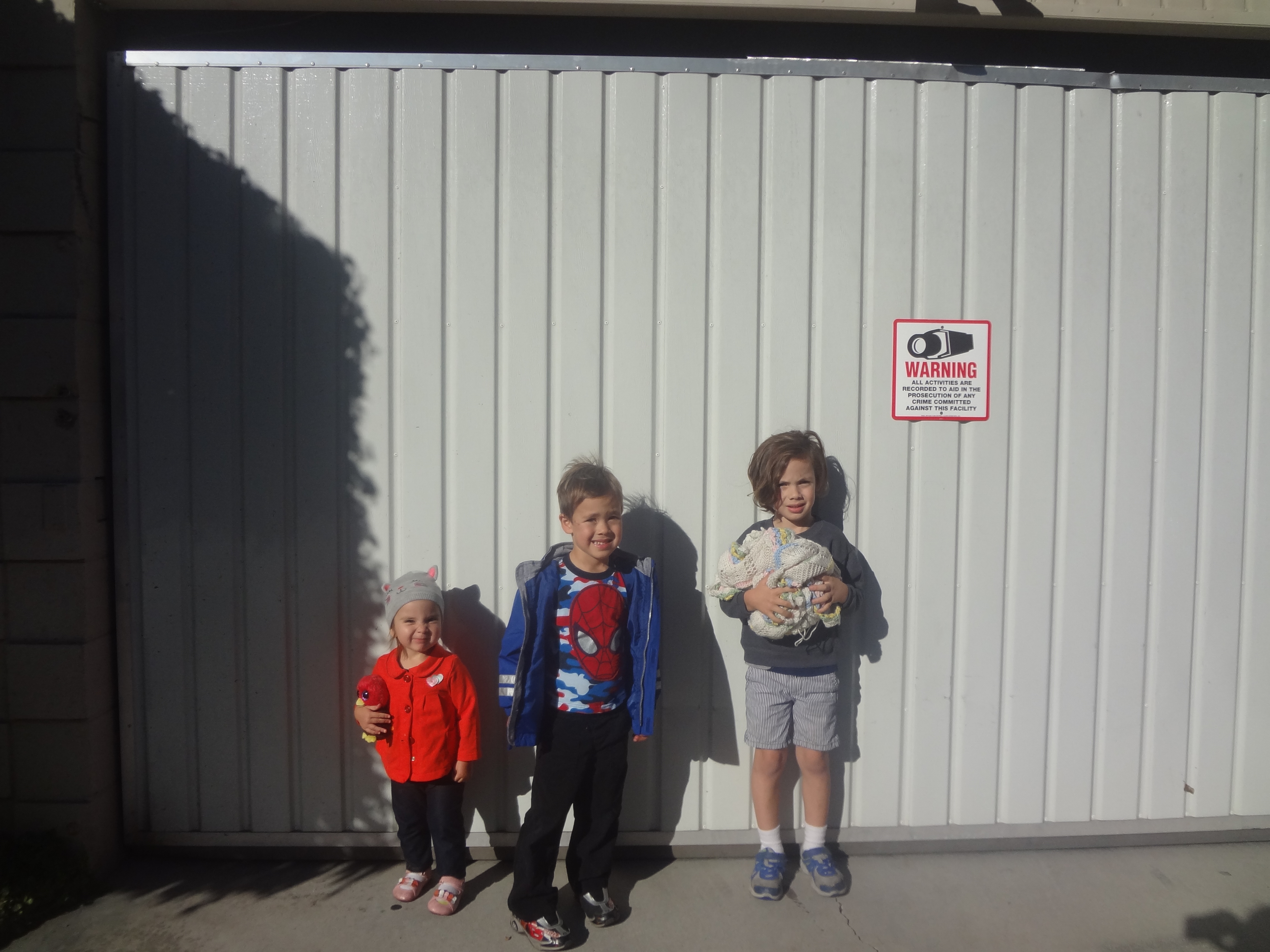 It’s a sign about “being under surveilance” but the boys have read the sign and have told me many times that it is a “Warning” and states that I will be arrested by police if I take a picture of the garage (there’s an image of camera). Of course I insist, to just snap a photo of them and then we can see if the police will come. At the moment I take the picture, Paul goes to put his leg up on the garage door, it echoes, and Henry is sure that is the sound of the police coming. He bolts! (and I crack up)