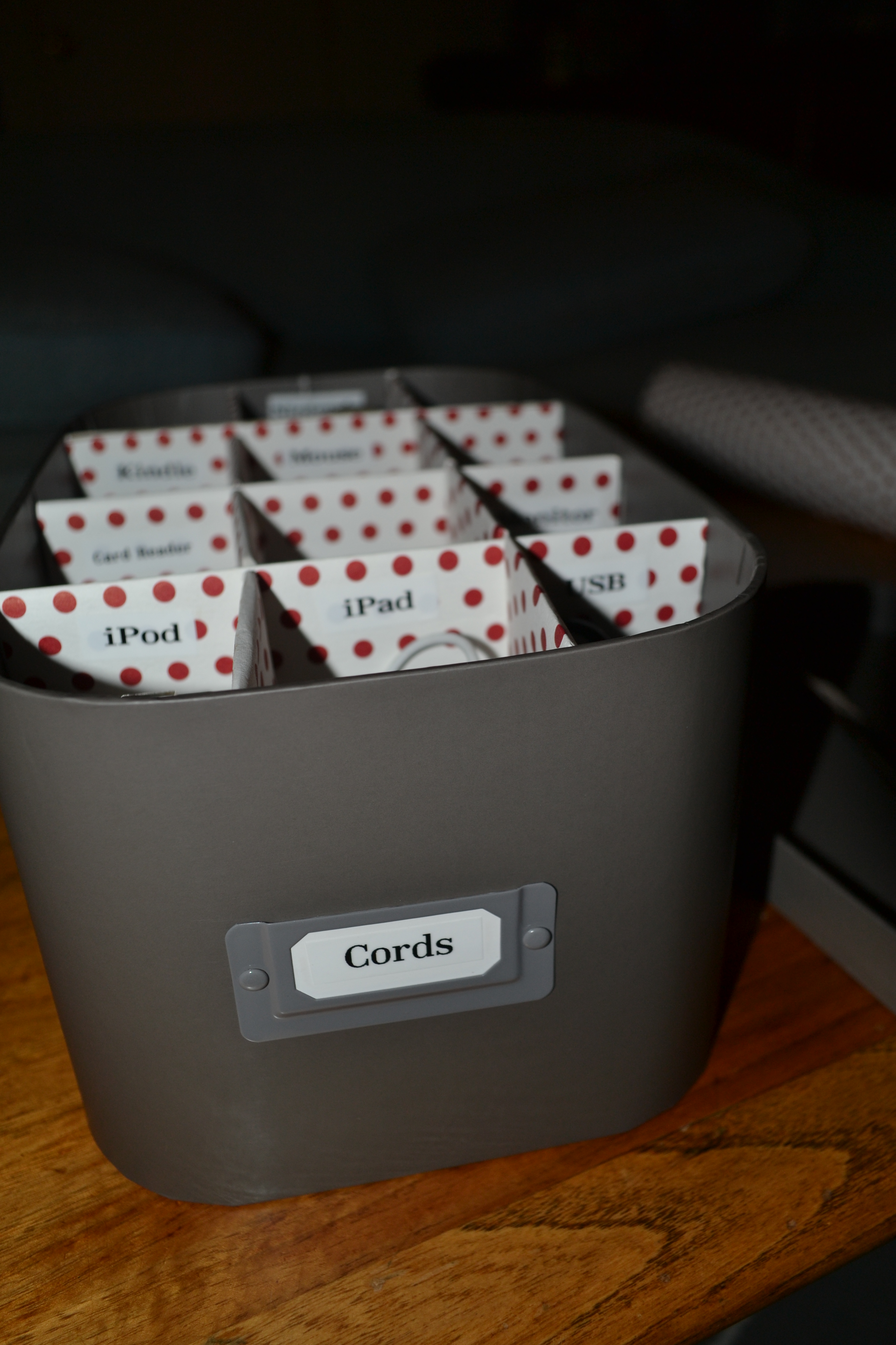 My friend Jenny gave me a website (iheartorganizing) and of all the ideas I really liked her cord organizer. So we dumped the cords