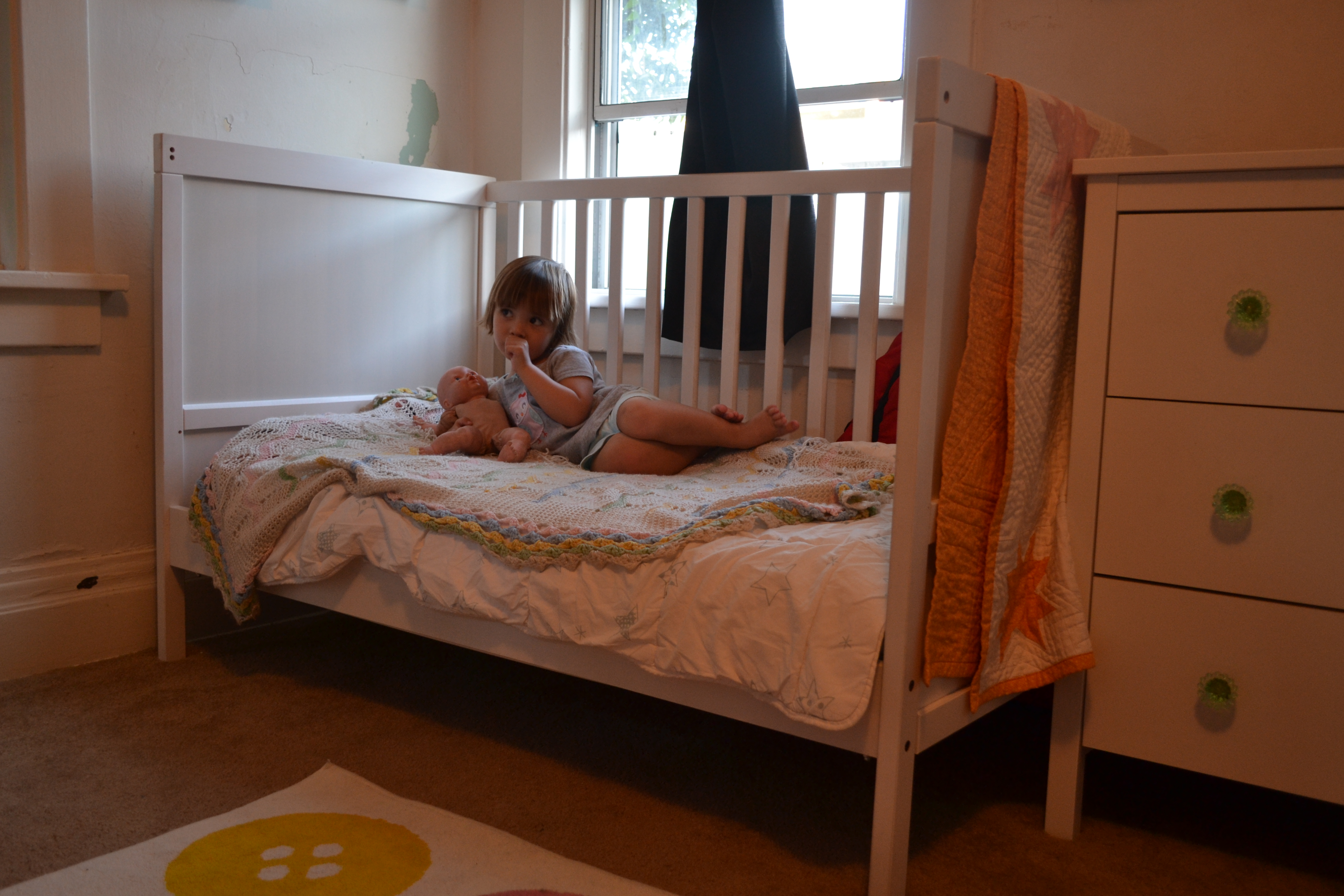 I can’t hold time back or reverse it. I can only find moments where I give in. Tonight was that moment. I hate the idea of her being able to climb out and run around and maybe get hurt. So rather than sleep lightly to listen for an escape, Joe quickly took the bars off and converted her crib into a bed.
