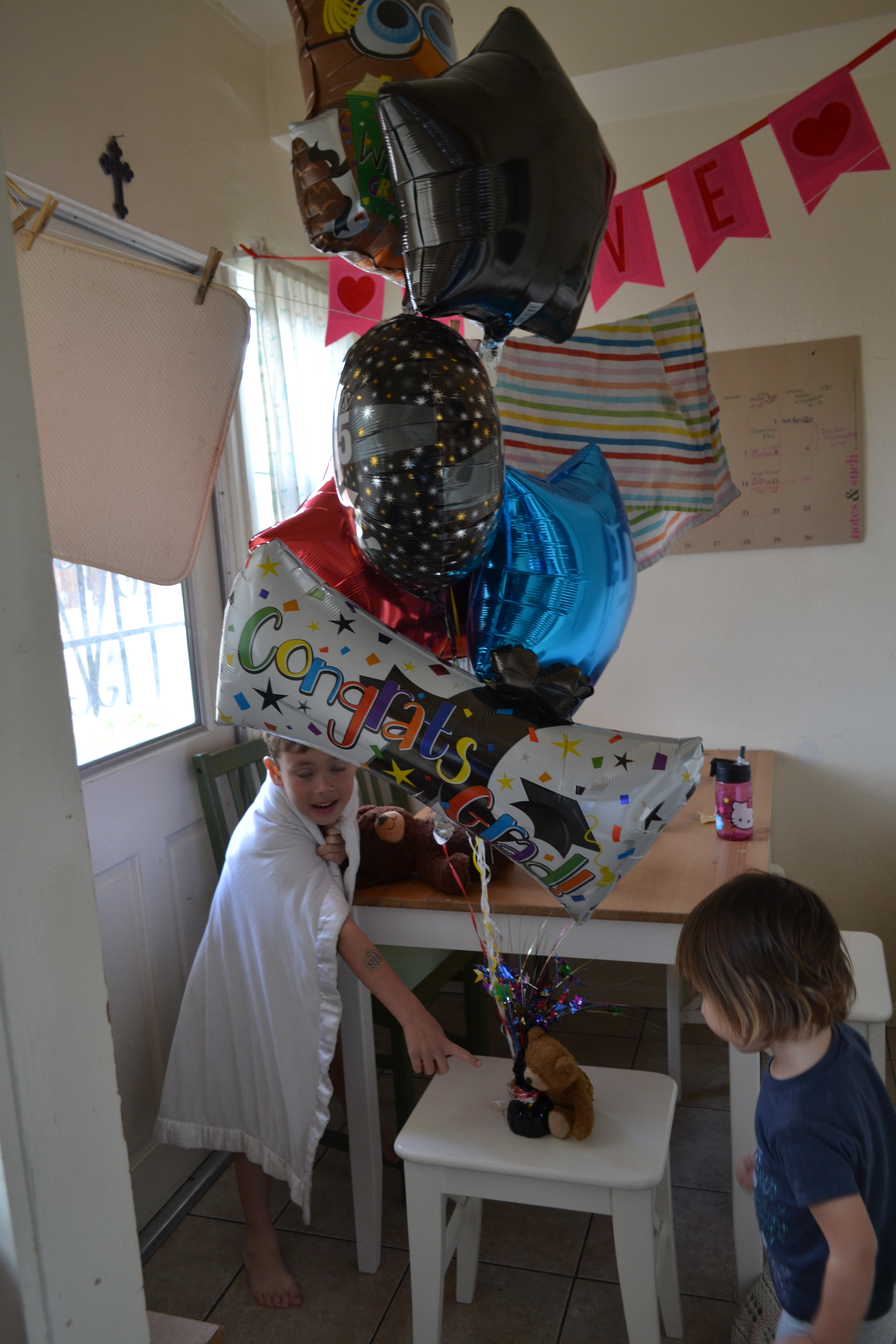 The clear marker of one HUGE feat: Joe is Done. He is all about the bragging that there is no homework, no more group projects, and he is officially able to join the working world. He already has a few sub jobs lined up for the month and some adventures planned with little ones. He is free. He came home with balloons and cake and a smile that follows so many years of hard work. Joe is done with his B.A. in liberal studies, multiple subject credential, and moderate/severe credential.