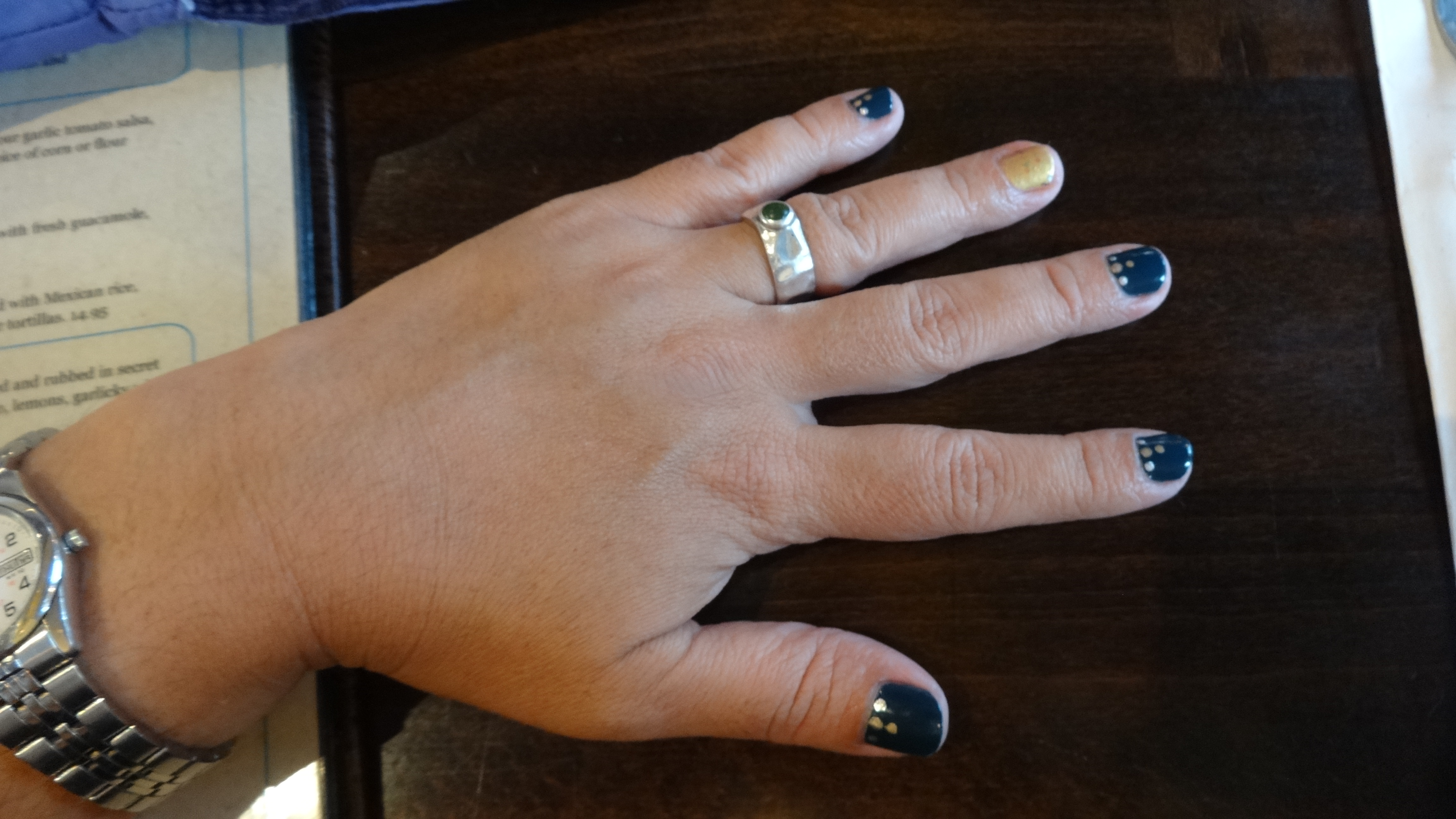 And I got a design with golden confetti ring fingers. Love it! This place is small so walk-ins are not always convenient. I called and they squeezed us in.