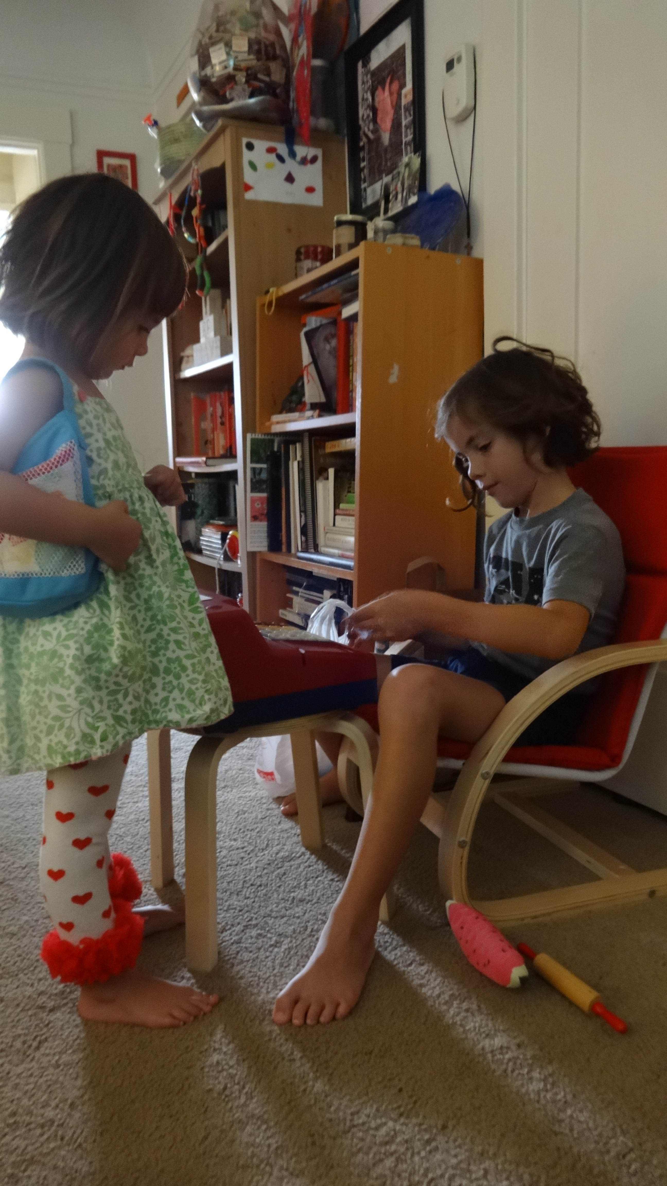 and played “Target.” They took turns shopping and ringing each other up, with a polite “Thank you for shopping at Target” at the end. A testimony to running errands for school supplies, packed lunches, and classroom set up.